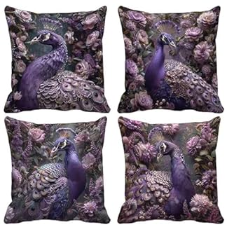 Kissenbezug Pfau Outdoor Kissen 4er Set, Wasserdichter Sofakissen Lila Kissenbezüge Leinen Dekokissen mit Unsichtbarem Reißverschluss Zierkissen für Wohnzimmer Garten Dekorative 65×65-lsy2504T5