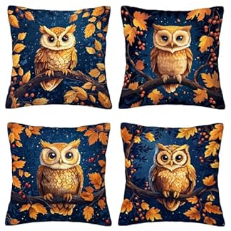 Kissenbezug 35×35 cm Kissenbezug Herbst Samt Kissenhüllen Eule 4er Set, Weich Quadrat Kopfkissenbezug mit Unsichtbarer Reißverschluss Sofakissen Dekokissen Geschenke für Frauen Deko Wohnzimmer A-41