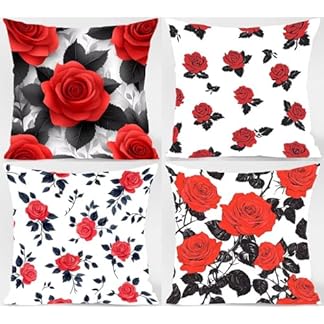 Kissenbezug 65x65cm 4er Set, Outdoor Kissen Rose Sofakissen Rot und Schwarz Dekokissen, Doppelseitiger Druck Wasserdichtes SanftKissenbezüGe, KissenhüLlen für Schlafzimmer Deko Wohnzimmer Model-11508