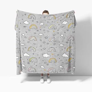 Kuscheldecken XXL 180×220 cm Weich Flauschig Cartoon-Wolken Und Regenbogen-Drucke Flanell Fleecedecke, Grau Kuscheldecke Warm TV Sofadecke Tagesdecke Kinderdecken, Wohndecke Für Bett