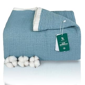 €43,99Produkt kaufenSE SOFTEXLY Kuscheldecke Baumwolle 100%, 4-lagige Weiche Kuscheldecke Musselin Tagesdecke, Bett-Überwurf Sommerdecke Sofadecke Wohndecke für Ganze Saison als Sofaüberwurf Hellblau Blanket 130x150cm