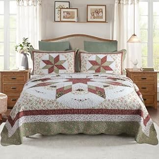 YAYIDAY Übergroßes Patchwork-Tagesdecken-Set für King-Size-Betten (308 x 295 cm), 100 % Baumwolle, wendbar, atmungsaktiv, roter Stern, geometrisch, gesteppt, mit Kissenbezügen, passend für alle