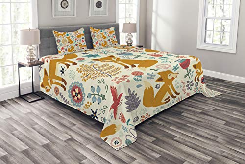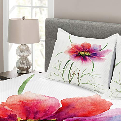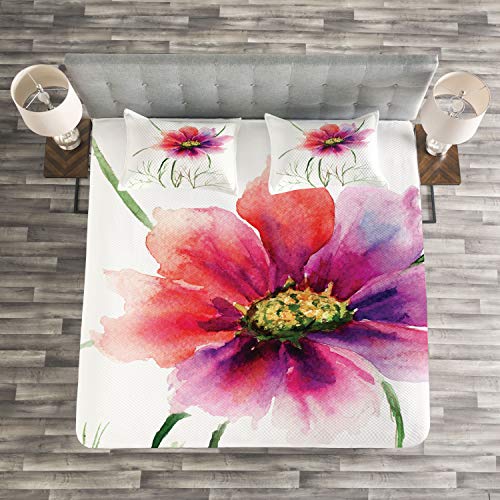 ABAKUHAUS Aquarell Tagesdecke Set, Blumenblüte Kunst, Set mit Kissenbezügen Waschbar, für Doppelbetten 220 x 220 cm, Fuschia Red Dark Green