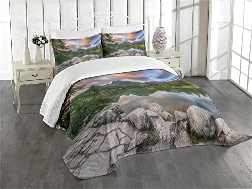 ABAKUHAUS Berg Tagesdecke Set, See durch Wald Berg, Set mit Kissenbezug Waschbar, für Einzelbetten 170 x 220 cm, Grau Grün
