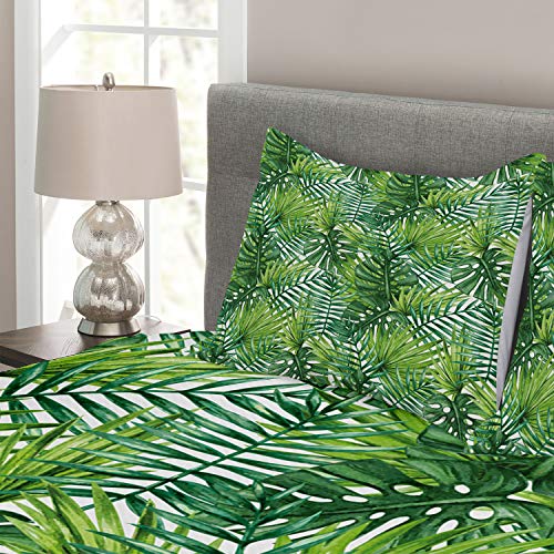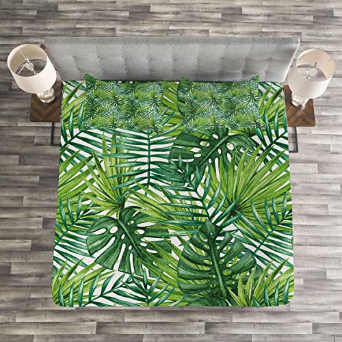 ABAKUHAUS Blatt Tagesdecke Set, Baum-Blätter Aquarell, Set mit Kissenbezügen Romantischer Stil, für Doppelbetten 220 x 220 cm, Hellgrün und dunkelgrün