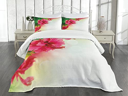 ABAKUHAUS Blumen Tagesdecke Set, Duft Blüten Garten, Set mit Kissenbezügen Maschienenwaschbar, für Doppelbetten 264 x 220 cm, Farngrün Pink