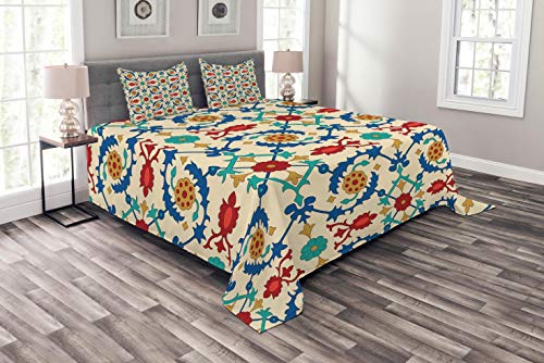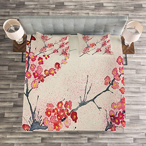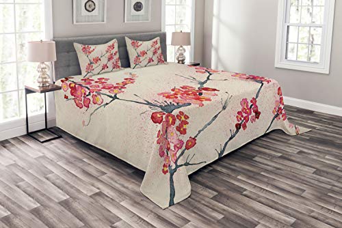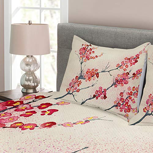 ABAKUHAUS Blumen Tagesdecke Set, Vintage Sakura Blumen, Set mit Kissenbezügen Kein verblassen, für Doppelbetten 220 x 220 cm, Beige Rosa