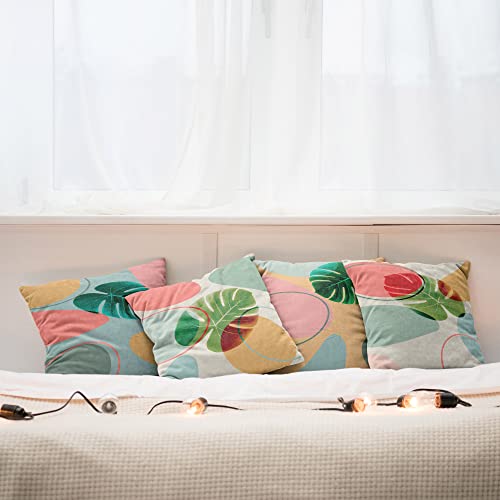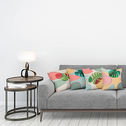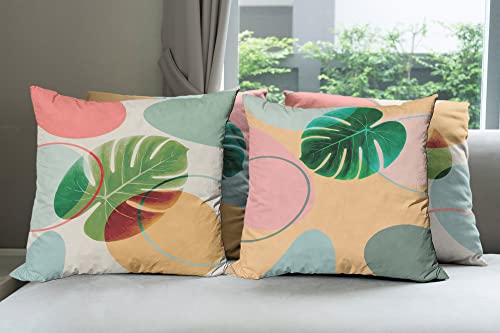 ABAKUHAUS Exotisch Dekokissen Kissenbezug 4er Pack, Monstera auf geometrischen Formen Modern Accent Doppelseitiger Digitaldruck, 45 cm x 45 cm, Dunkles Türkis und Multicolor