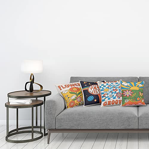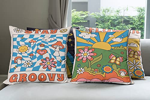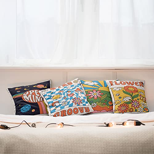 ABAKUHAUS Hippie Dekokissen Kissenbezug 4er Pack, Groovy Floral Raum Trippy Modern Accent Doppelseitiger Digitaldruck, 60 cm x 60 cm, Eierschale Multicolor