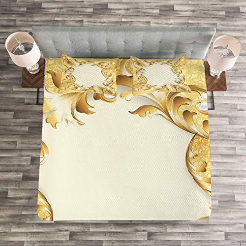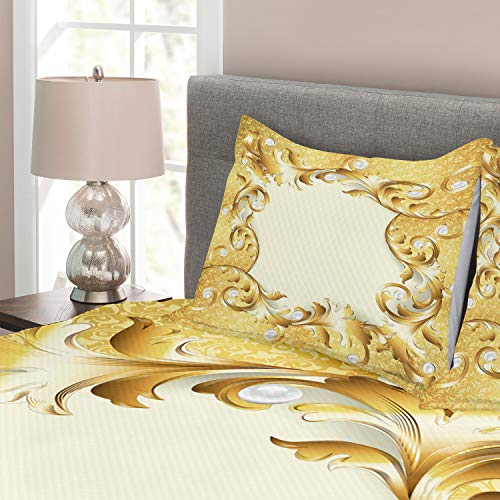 ABAKUHAUS Jahrgang Tagesdecke Set, Goldene Blumenverzierung, Set mit Kissenbezügen Waschbar, für Doppelbetten 220 x 220 cm, Creme Gelb
