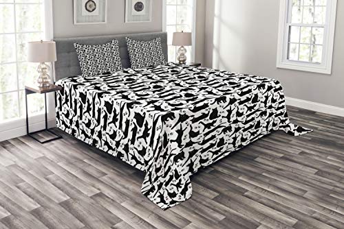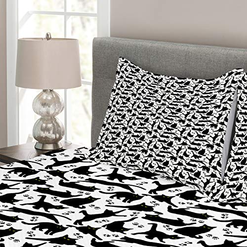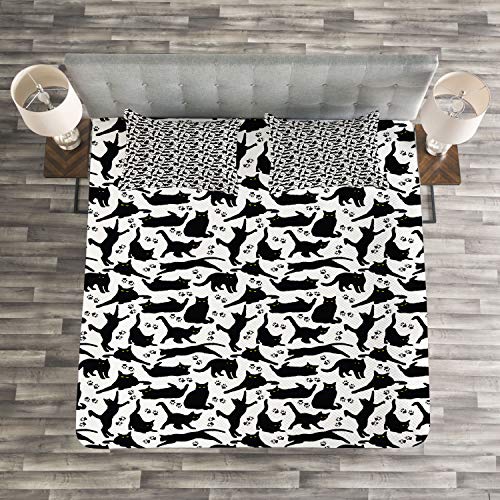 ABAKUHAUS Katze Tagesdecke Set, Schwarze Katzen Verschiedene Posen, Set mit Kissenbezügen Sommerdecke, für Doppelbetten 220 x 220 cm, Weiß Schwarz