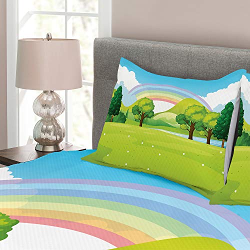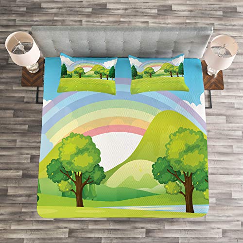 ABAKUHAUS Märchen Tagesdecke Set, Regenbogen-Bäume Wolke Motiv, Set mit Kissenbezügen Ohne verblassen, für Doppelbetten 220 x 220 cm, Mehrfarbig