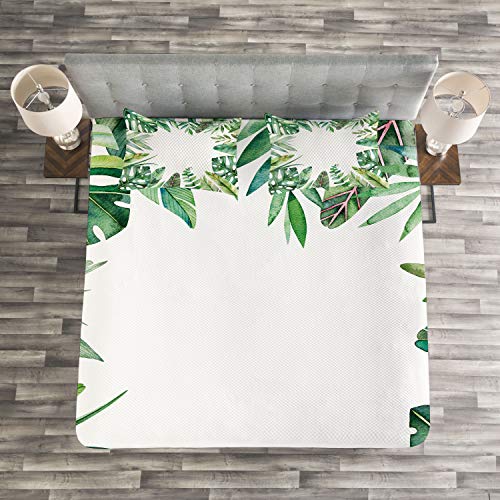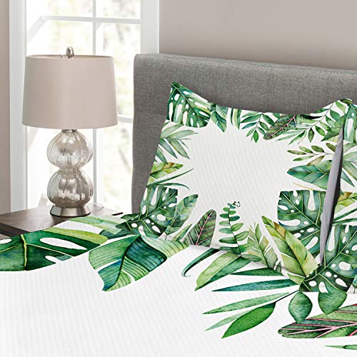 ABAKUHAUS Pflanze Tagesdecke Set, Dschungel Themenbild, Set mit Kissenbezügen Sommerdecke, für Doppelbetten 220 x 220 cm, Farngrün