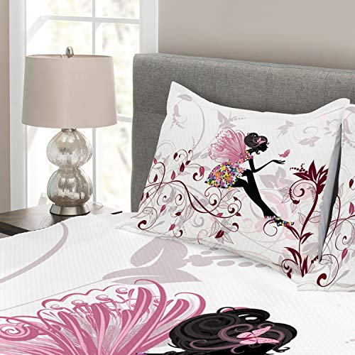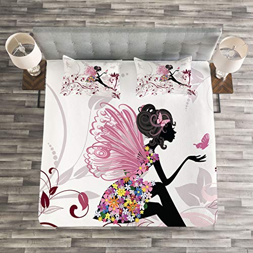 ABAKUHAUS Prinzessin Tagesdecke Set, Blumen-Fee Schmetterlinge, Set mit Kissenbezügen Moderne Designs, für Doppelbetten 220 x 220 cm, Kastanienbraun Schwarz Rosa