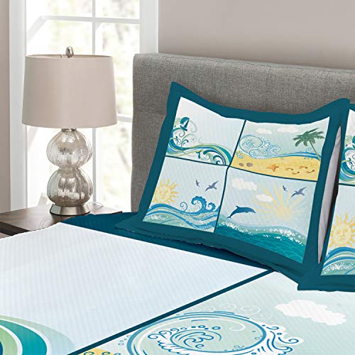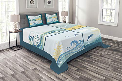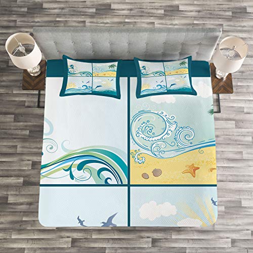 ABAKUHAUS Strand Tagesdecke Set, Maritime Themenwellen, Set mit Kissenbezügen Sommerdecke, für Doppelbetten 220 x 220 cm, Beige Grün Blau