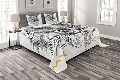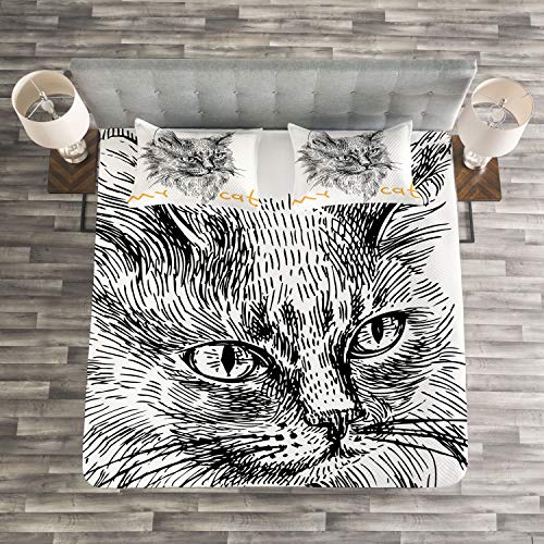 ABAKUHAUS Tier Tagesdecke Set, Hand gezeichnete Katze, Set mit Kissenbezügen luftdurchlässig, für Doppelbetten 220 x 220 cm, Mustard Schwarzweiss