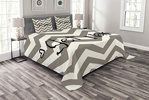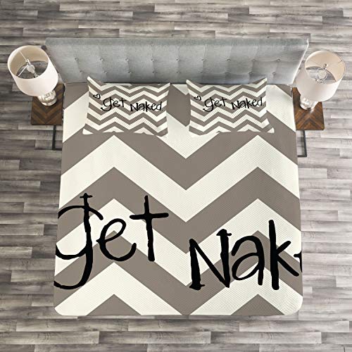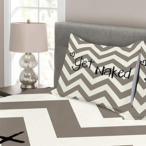 ABAKUHAUS Zitat Tagesdecke Set, Get Naked Herz Zig Zag, Set mit Kissenbezügen Waschbar, für Doppelbetten 220 x 220 cm, Taupe Creme schwarz