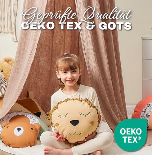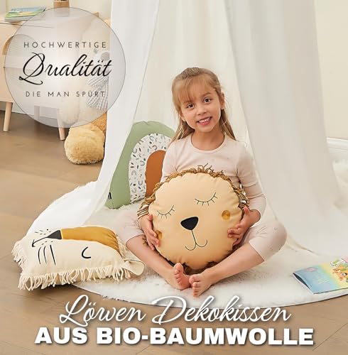 🎁 Zauberhafter Löwen Kissen aus 100% Bio-Baumwolle gefertigt und mit Oeko Tex 100 und GOTS-Zertifizierung versehen, für höchste Sicherheit und Qualität im Kinderzimmer