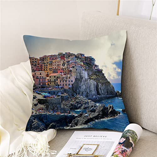 AMDXD Dekorative Zierkissenhülle, 45x45cm Dekokissen 1 Stücke Weiche Quadratisch Dekokissenbezüge mit Strand Haus Konstruktion Muster, in Leinen, für Sofa Wohnzimmer (Leinen, Blau Weiß Bunt)