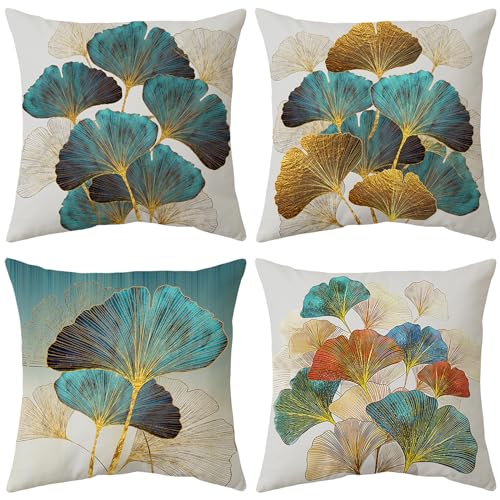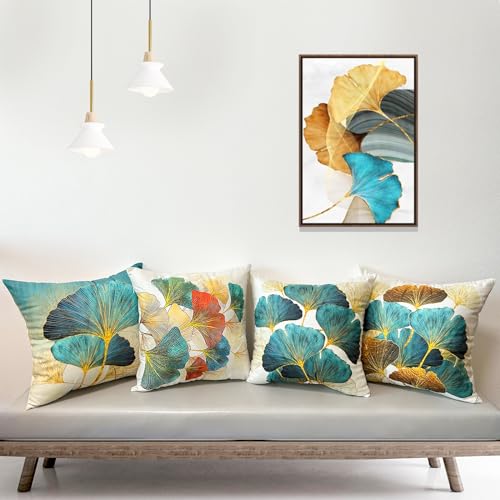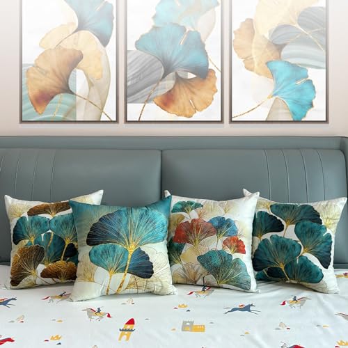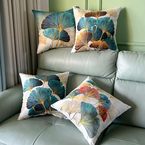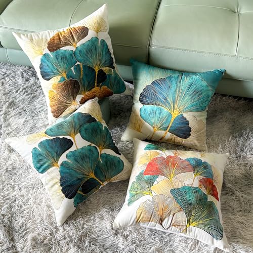 ARNTY Kissenbezug 45 x 45 cm, 4er Set Samt Dekorativer Kissenbezüge Sofakissen Dekokissen mit Verstecktem Reißverschluss für Büro Garten Sofa, nur Kissenbezug(Ginkgo Biloba)