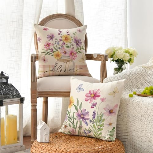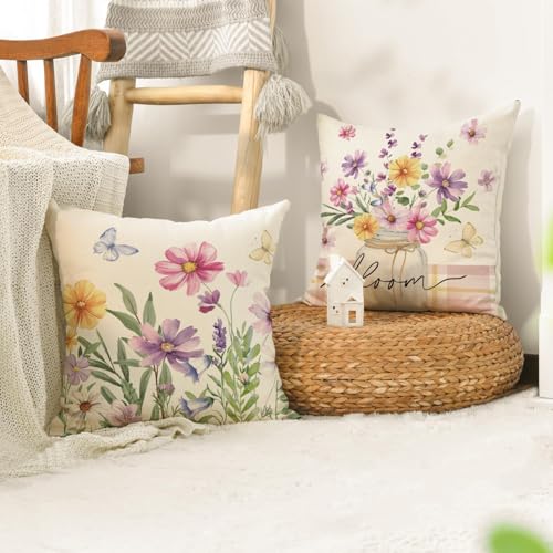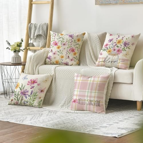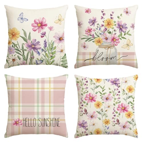 Artoid Mode Blumen Vase Blätter Frühling Kissenbezüge 4er Set, 40×40 cm Sommer Strifen Tupfen Sunshine Zierkissenbezug Couch Wohnzimmer Deko
