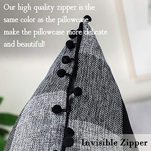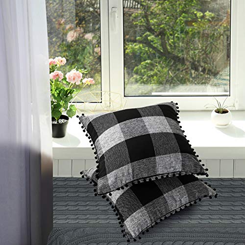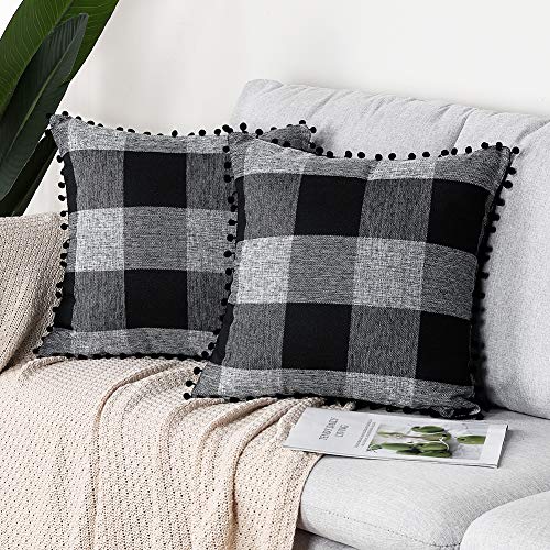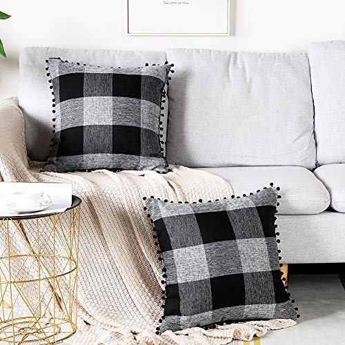 Artscope 2er Set Kariert Kissenbezug mit Pompoms Dekokissen Super Weich Baumwolle Leinen Kissenbezüge Decor Kissenhülle für Sofa Büro Wohnzimmer 18x18Inch 45x45cm Schwarz & Grau