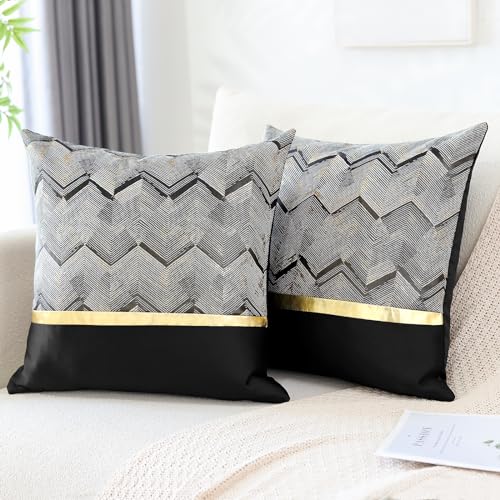 Artscope 2er Set Kissenbezug für Sofa Auto Schlafzimmer Luxuriöser Moderne Minimalist Goldenen Ledernähten Wellenstreifen Dekokissen Kissenhülle Kissen Fall 45x45cm (Schwarz)