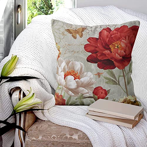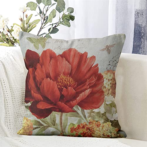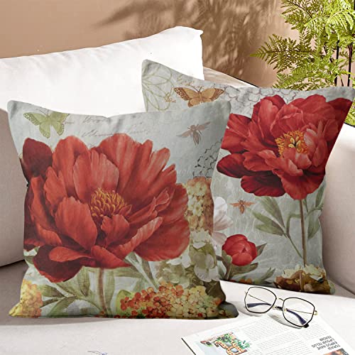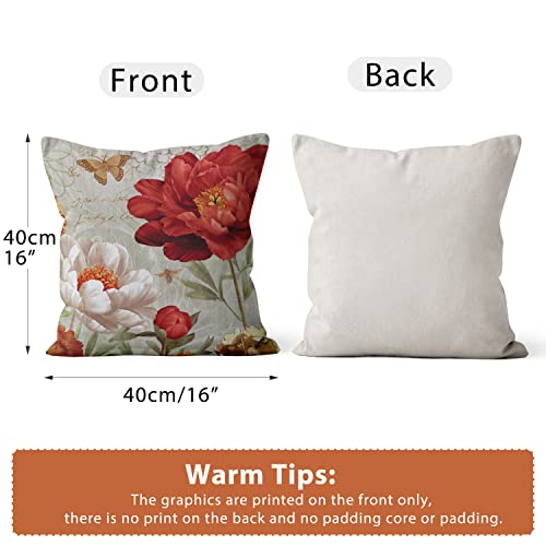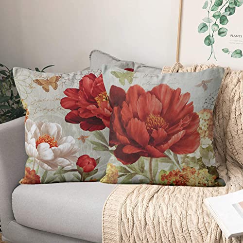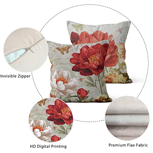 ASDCXZ Blume Kissenbezug 40×40 cm 2er Set, Frühling Retro Rot Weiß Blume Sofa Kissen Bezug Dekokissen Kissenbezüge Kissenhülle Waschbar Polyester Flachs Textil Outdoor Polster Kopfkissenbezug