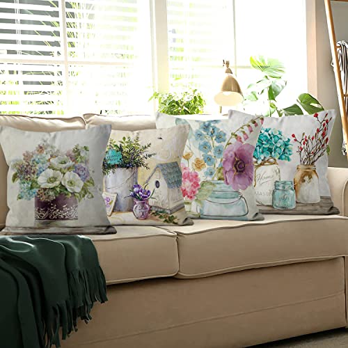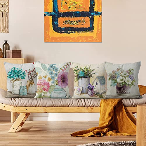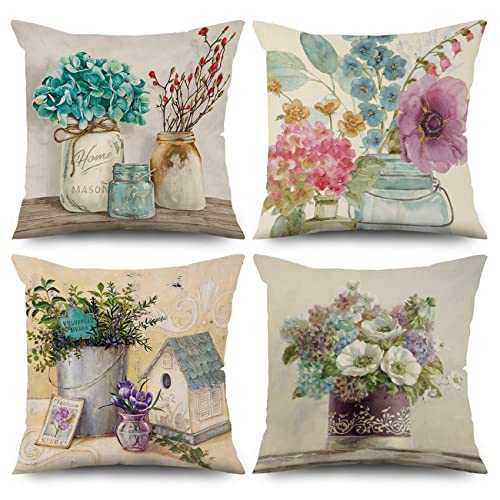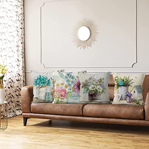 ASDCXZ Blume Kissenbezug 40×40 cm 4er Set, Retro Handgemalt Blume Sofa Kissen Dekokissen Kissenbezüge Kissenhülle Waschbar Polyester Flachs Textil Outdoor Polster Kopfkissenbezug Kissen Bezug