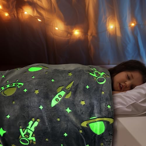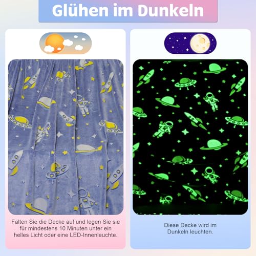 Einzigartiges leuchtendes Design: Diese leuchtende im dunkeln decke ist in einem leuchtenden Blau gehalten und verziert mit einem lustigen Flugzeug-Muster. Das einzigartige leuchtende Design hilft, Kindern die Angst vor der Dunkelheit zu nehmen, und lädt sie ein, in ihren Träumen mit mutigen Astronauten durch den Weltraum zu reisen.