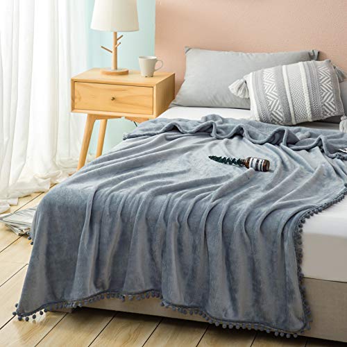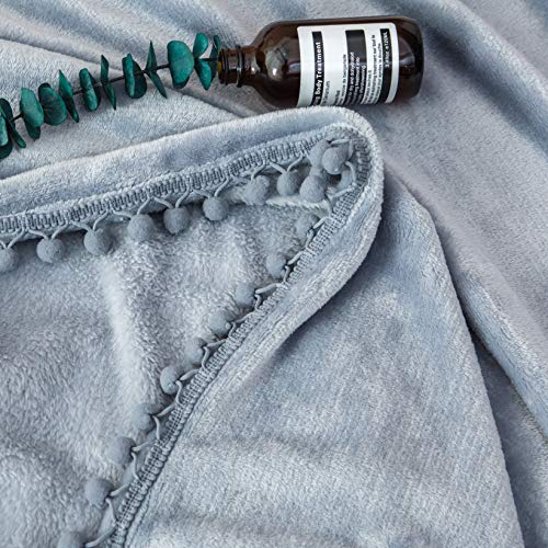 AYSW Flauschige Kuscheldecke mit Pompoms Einfarbig Grau 150x200cm – warm & weich Microfaser flanelle Fleecedecke, Falten-beständig Wohndecke/Sofadecke