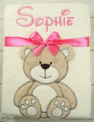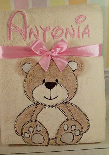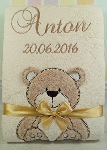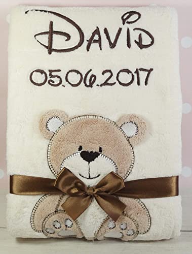 Babydecke mit Namen und Datum bestickt Baby Geschenke Geburt (Beige – Teddybär)