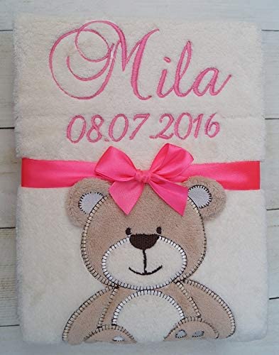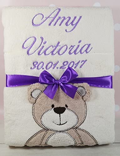 Wir bieten eine schöne Microfaser Decke mit eingesticktem Namen, Geburtsdatum, Gewicht und Uhrzeit