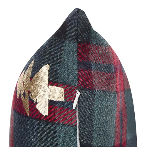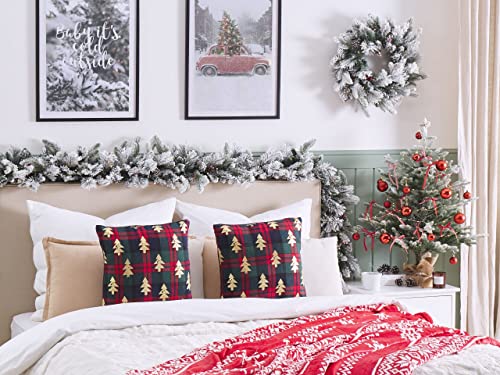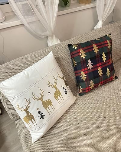 Dekokissen mit Weihnachtsmotiv. Weihnachten ist für uns ganz eine besondere Zeit. Deshalb schenken wir den Details so unbegrenzt Vorsicht, wenn es darum geht, unser Zuhause mit weihnachtlichen Dekorationsartikeln zu schmücken. Dieses Dekokissen-Set fügt sich dank der klassischen Farbpalette nahtlos in jede Umgebung ein. Jedes der Kissen ist mit einem schönen, goldfarbenen Weihnachtsbaummuster mit Foliendruck versehen, das durch den karierten, grünen und roten Hintergrund perfekt zur Geltung kommt. Die Kissen verfügen über eine weiche Polyesterfüllung für höchsten Komfort und einen Reißverschluss zur einfachen Reinigung.