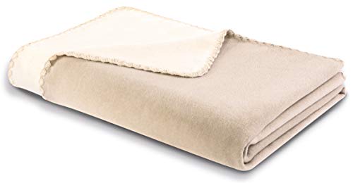 Die hautsympathische Baumwolldecke in der klassischen Farbkombination beige-ecru ist temperaturausgleichend, antistatisch und mit neuartigem Muschelsaum eingefasst.