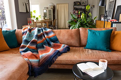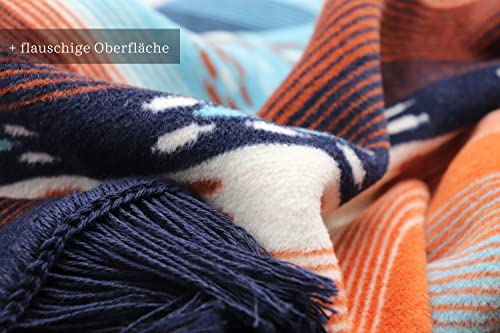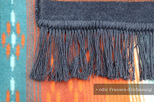 biederlack® weiche Kuschel-Decke ‚Peru‘ aus Baumwollmischgewebe I Ethno Wohndecke in dunkelblau-orange I Made in Germany I Bunte Fransen-Decke in 150×200 cm I nachhaltig produziert I Öko-Tex