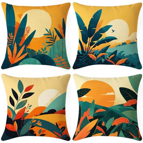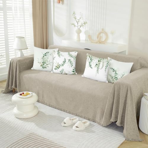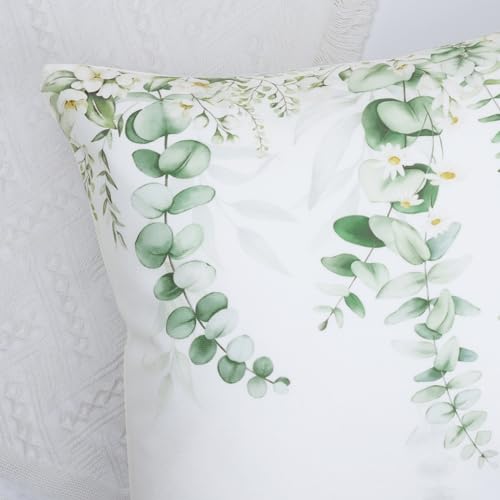 Bonhause 4er Set Kissenbezüge Eukalyptus Blätter 45 x 45 cm Salbeigrüne Blätter Weiße Blumen Dekorative Kissenhülle Zierkissenbezüge für Sofa Schlafzimmer Zuhause Garten Dekoration