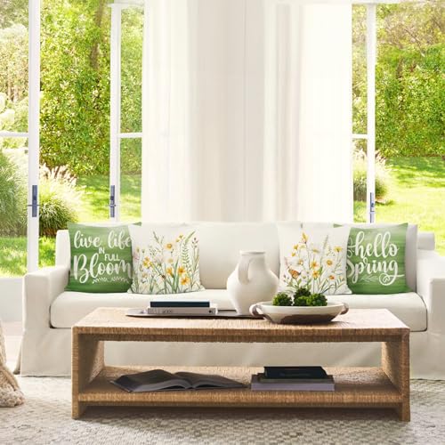 Hallo Frühling Design: Einsammeln Sie sich die Schönheit der Natur nach drinnen mit zarten gelben und weißen Blumen, Blättern und üppigen Grüntönen mit lebendigem Phrasendesign, unsere Frühlings blumen kissenbezüge werden jeden All erhellen.
