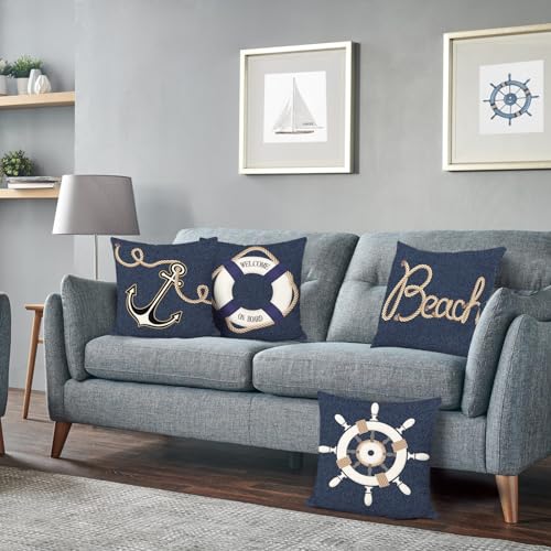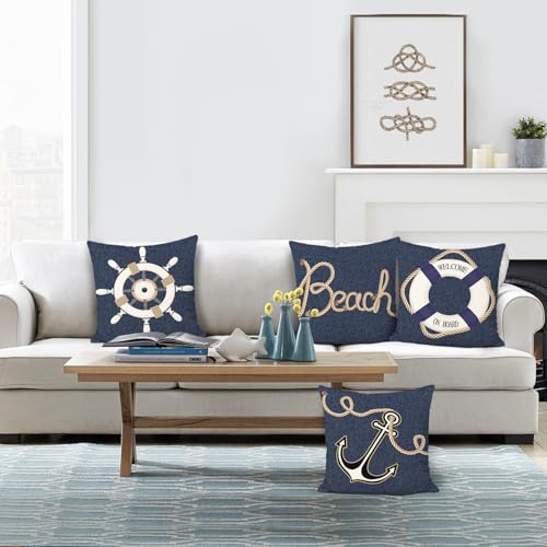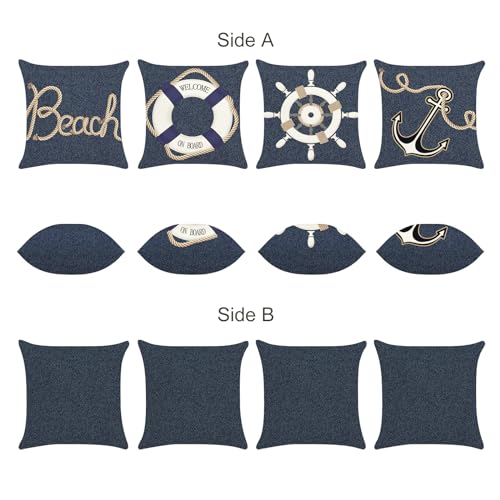 Bonhause 4er Set Kissenbezüge Nautisch Anker 45 x 45 cm Doppelseitig Denim-Textur Polyester Leinen Blau Dekorative Kissenhülle Zierkissenbezüge für Sofa Schlafzimmer Wohnzimmer Zuhause Dekoration