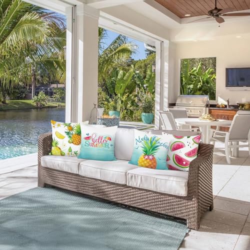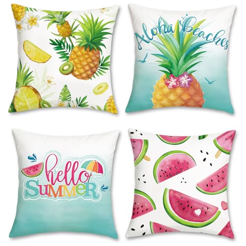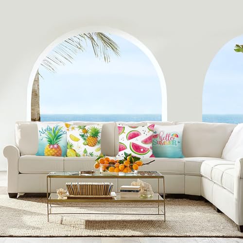 Sommerfrucht Design: Verleihen Sie Ihrer Wohnkultur einen Hauch von Sommer mit diesen lebendigen, von Früchten inspirierten Kissenbezügen mit lustigen Wassermelonen- und Ananasmotiven.