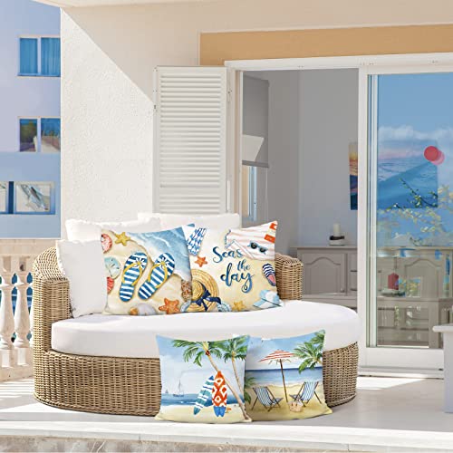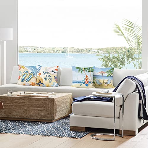 Bonhause 4er Set Kissenbezüge Sommer Strand 45 x 45 cm Seestern Surfbrett Palme Meer Landschaft Dekorative Kissenhülle Zierkissenbezüge für Sofa Wohnzimmer Zuhause Sommer Dekoration