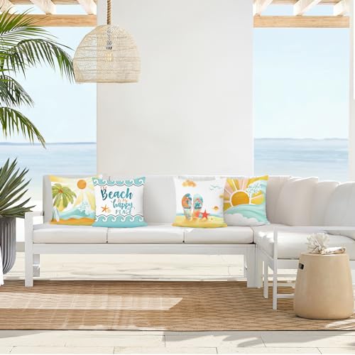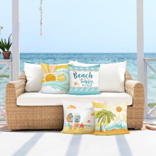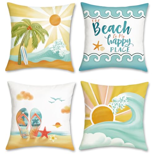 Bonhause 4er Set Kissenbezüge Strand 45 x 45 cm Ozean Sonne Küste Palme Dekorative Kissenhülle Zierkissenbezüge für Sofa Schlafzimmer Zuhause Patio Dekoration