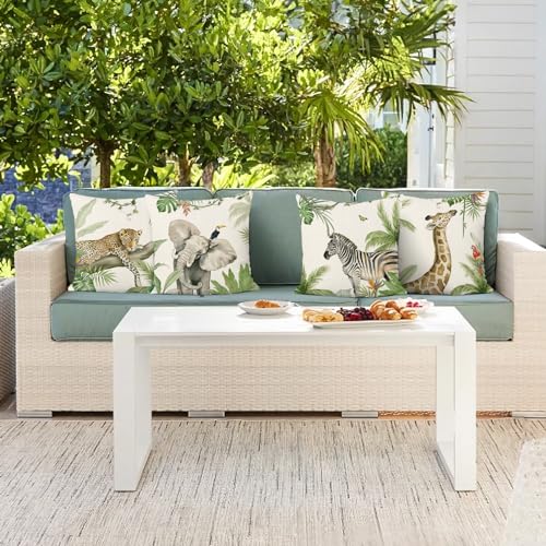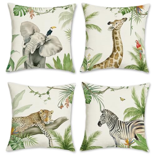 Tier-Design: Dekorieren Sie Ihr Zuhause mit unseren Tierkissenbezügen mit Dschungeltieren wie Elefanten, Giraffen, Zebras und Leoparden, umgeben von tropischen Blättern. Ideal, um Ihrem Wohnzimmer, Schlafzimmer oder Außenterrassenbereich einen Hauch von Natur zu verleihen.
