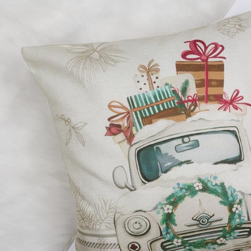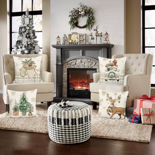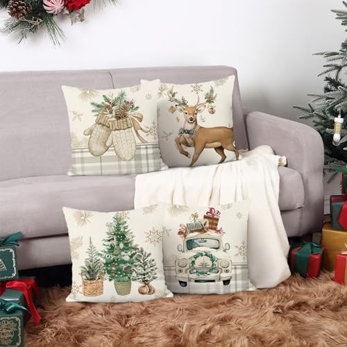 Bonhause 4er Set Kissenbezüge Winter Rentier 45 x 45 cm Baum LKW Handschuhe Winterurlaub Dekorative Kissenhülle Zierkissenbezüge für Sofa Winter Dekoration