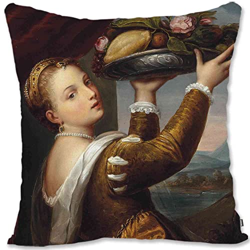 BONNIU Deko Kissenbezug mit Reißverschluss 50X50 cm Samt Kissenschutz Klassische Frauenportrait Kunst – Titian – Mädchen Mit Einem Korb Früchten Lavinia AN051