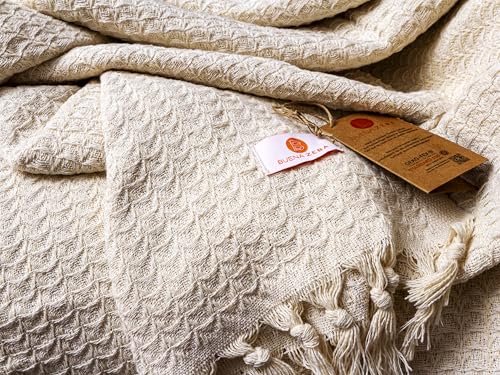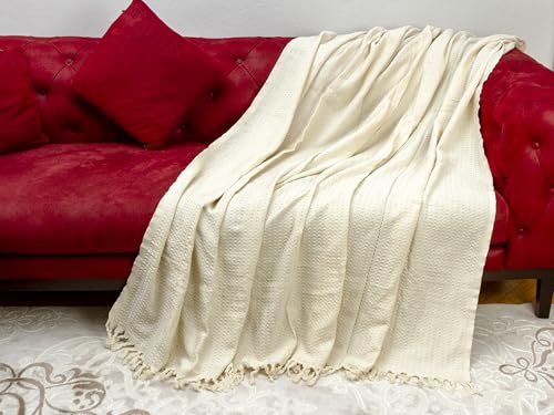 Buena Zeba Traditionelle Baumwolldecke mit Zickzack-Muster, Fransen, 200 x 235 cm (Ecru)