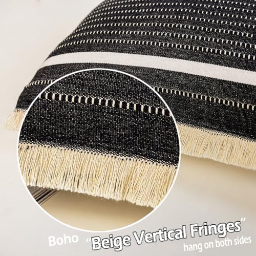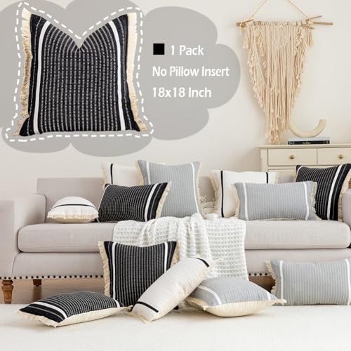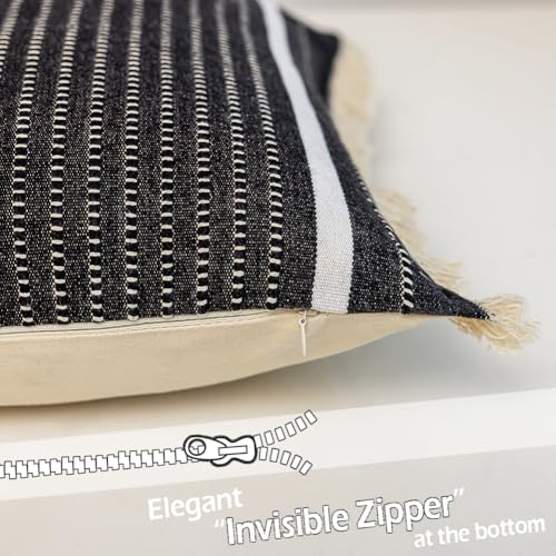 Ästhetische Raumdekoration: Dieser schwarz gestreifte Kissenbezug mit 45,7 x 45,7 cm ist elegant gestaltet aus weichem, strapazierfähigem Baumwoll- und Polyester-Mischgewebe. Das Baumwollgewebe und die Quasten im Bohemian-Stil entlang der Kanten verleihen einen Hauch von künstlerischem Flair. Perfekt für den täglichen Gebrauch.