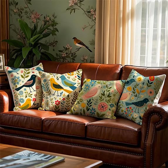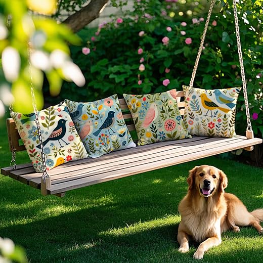 Cirzone Outdoor Kissenbezüge 4 Stück 45 x 45 cm Dekorative Outdoor Kissen Wasserfest Frühlingsblumen und Vögel Grafik Kissenbezüge Werden für Sofakissen Garten Outdoor