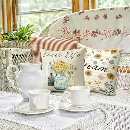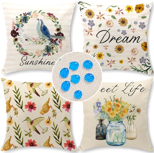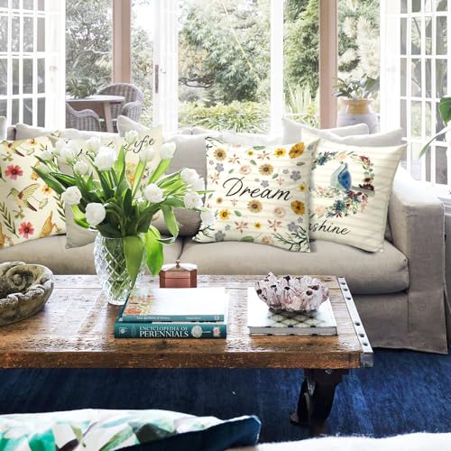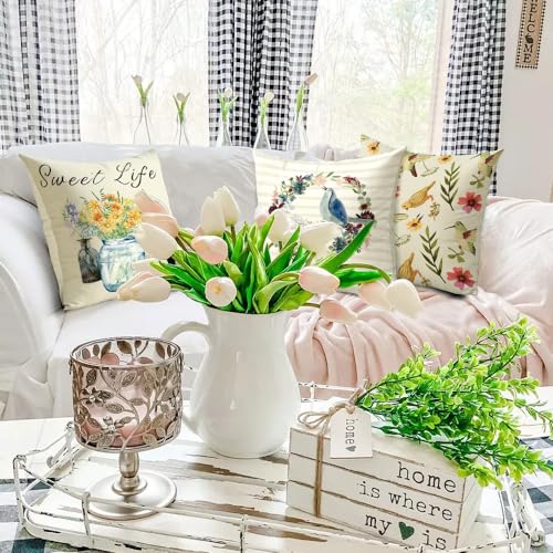 Cirzone Wasserdicht Kissenbezug Frühling 4er Set 45 x 45 cm Dekorative Outdoor Kissen Wasserfest Atmungsaktiv Vase Blumen und Vögel Kissenbezug Gartendeko für Draußen Sofakissen Garten Outdoor…