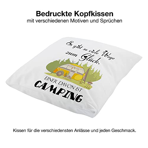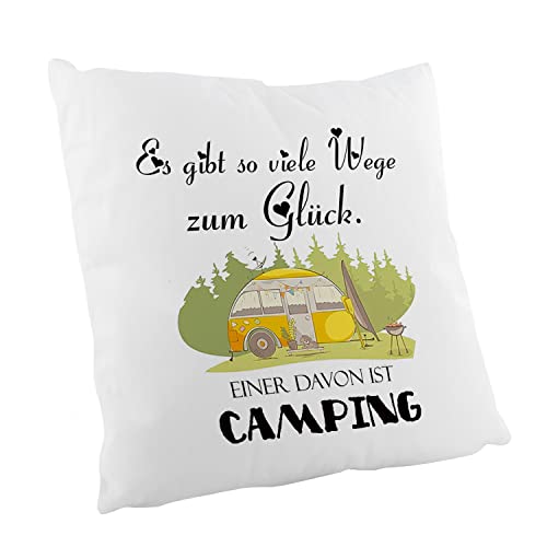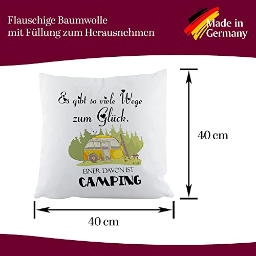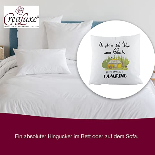 Crealuxe Kissen Es gibt viele Wege zum Glück, Einer Davon ist Camping – 40x40cm – Flauschiges Zierkissen, Sofakissen, Bedrucktes Kissen, Baumwollkissen